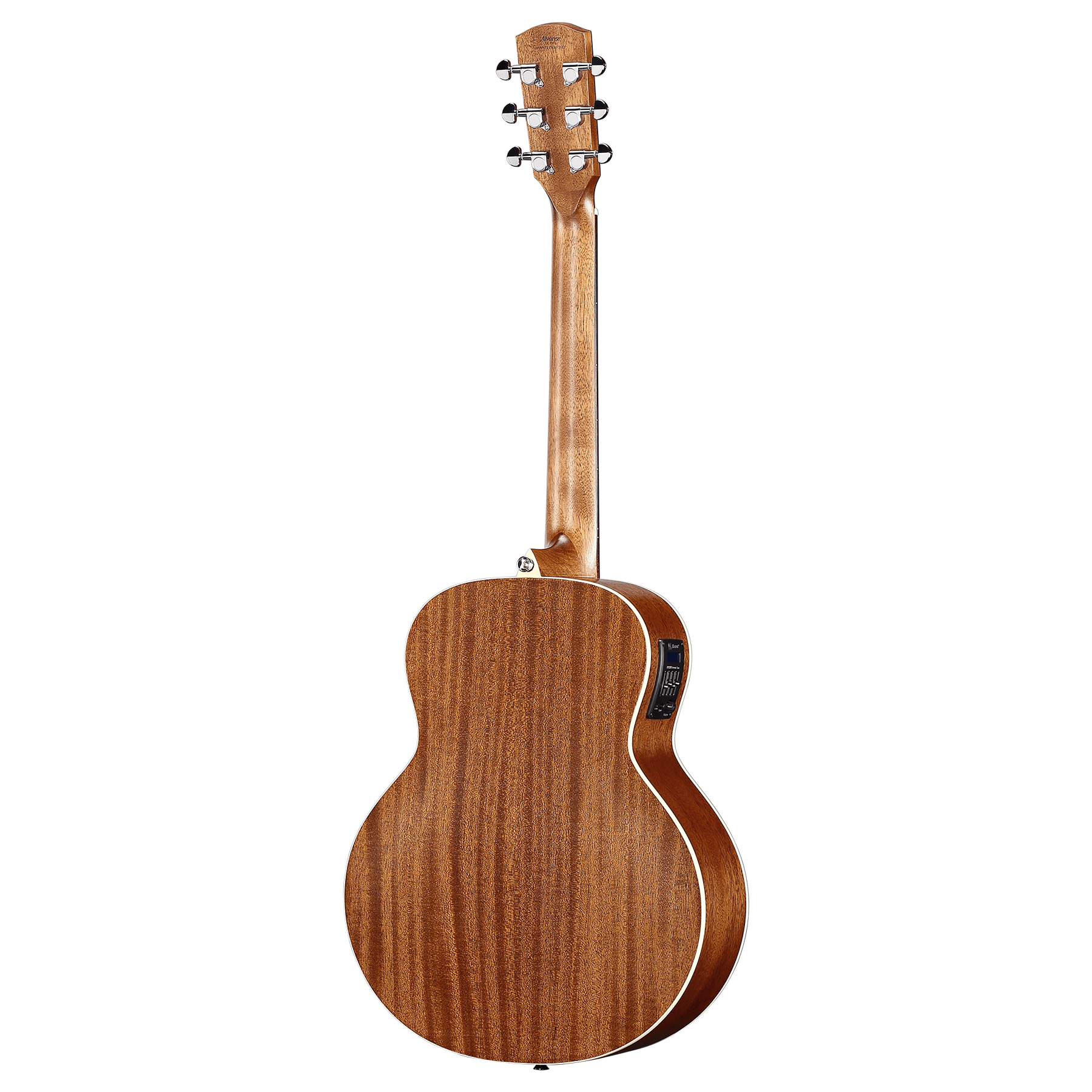Each model starts strong with a solid top; namely, this Little Jumbo happens to show off an A+ Sitka spruce top with a balanced projection. This guitar also has a forward-shifted Type 2 bracing pattern to harness optimal full-body resonance and double down on top strength. The African mahogany of the back and sides adds to the delightful voice of this little guitar for a voice that’s focused and instantly responsive. The mahogany neck of the Artist Little Jumbo rests easily in the hand with a shape that goes from a soft “V” to a “C” shape. It’s joined to the body with a dovetail neck joint to enhance full-body resonance and is capped with a delightfully playable Indian laurel fingerboard.
