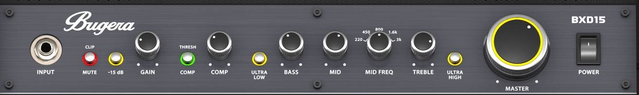 Huge power and light weight are great features, but there’s so much more to the Bugera BXD15 bass combo amp. The passive Gyrator circuitry with tube-inspired sound gives you authentic tone, and a selectable mid-frequency switch conjures five classic sound variations so you shape the sound for your particular playing style. And there are switchable ultra-low and ultra-high functions that add bass or treble boosts, respectively. We know compression, and we know you’ll appreciate the compression options included in the Bugera BXD15 bass combo amp. The studio-grade compressor provides transparent, musical compression gently engages and smooths out peaks for the ultimate tone. But it doesn’t stop there, as Bugera built in special Dynamizer technology that further enhances your tone. What is this Dynamizer and what does it do? Think of it as parallel compression, like that used in the studio for years. You signal is split into two discrete signals: a dry version and a heavily compressed version. The Dynamizer recombines these separate signals, giving you the ability to get the most out of your tone! You get big power and tons of tone and feature with the Bugera BXD15 bass combo amp!