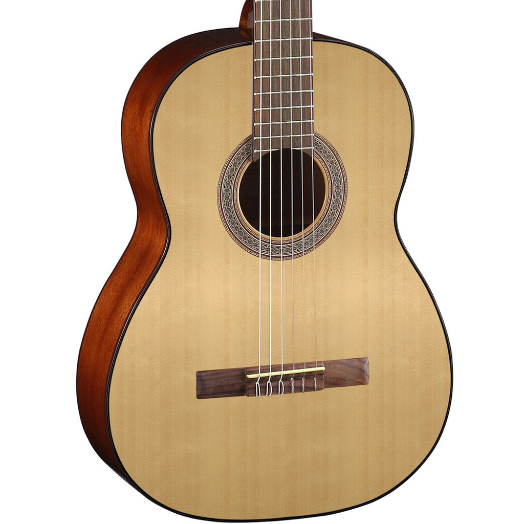Traditional classical guitar fan bracing is used internally to maximize the vibrational characteristics of nylon strings.