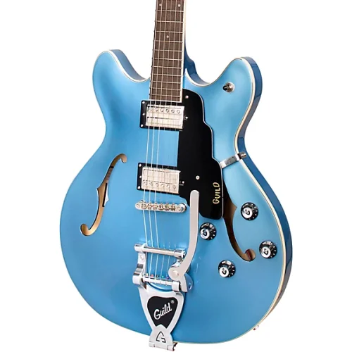 The double-cut Starfire I DC is based on a classic Guild design. Its arched center-block construction supplies the airy, resonant quality of some timeless Guild semi-hollow electrics, while at the same time helping to neutralize squealing and squelching in a loud performance setting. This turns out to be quite an asset onstage, especially for rock music. Standard-sized HB-2 alnico humbuckers — which build off of Guild’s iconic HB-1s — supply a warmth and bite that compares favorably to some classic PAFs. Not only that, but push-pull pots unlock a distinct single-coil cluck that suits blues, surf, country, and rock music superbly. This Guild Starfire I DC features a Guild-branded vibrato bridge that’s built for expressive players. Considering its price and pedigree, the Guild Starfire I DC is one of the most appetizing electrics to come out this season.