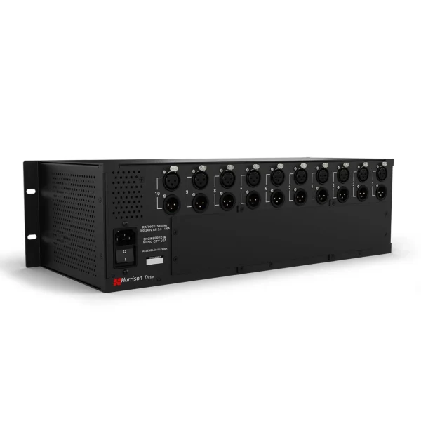 The Harrison Audio D510r 500 Series chassis houses up to 10 single-width modules — so far, so good, right? However, this innovative 500 Series rack also sports a trio of distinct features that distinguish it from the competition. First, its novel internal power supply design is rated for 170mA per slot, which is over 30% higher than the standard 130mA per slot specification set by the VPR Alliance. The beefy PSU rating is significant, as it allows the D510r to adequately power even the most current-hungry modules. Secondly, a specialized slot accommodates the optional D510 Dante interface card, which provides direct interfacing with a Dante AoIP network. Finally, we come to Harrison’s D510mx 10-in, 2-out analog mixer module, which lets you create a stereo mix from up to eight 500 Series modules installed in the D510r. With both of these options installed, your D510r chassis becomes a powerful computer interface that uses your favorite 500 Series modules as input sources!