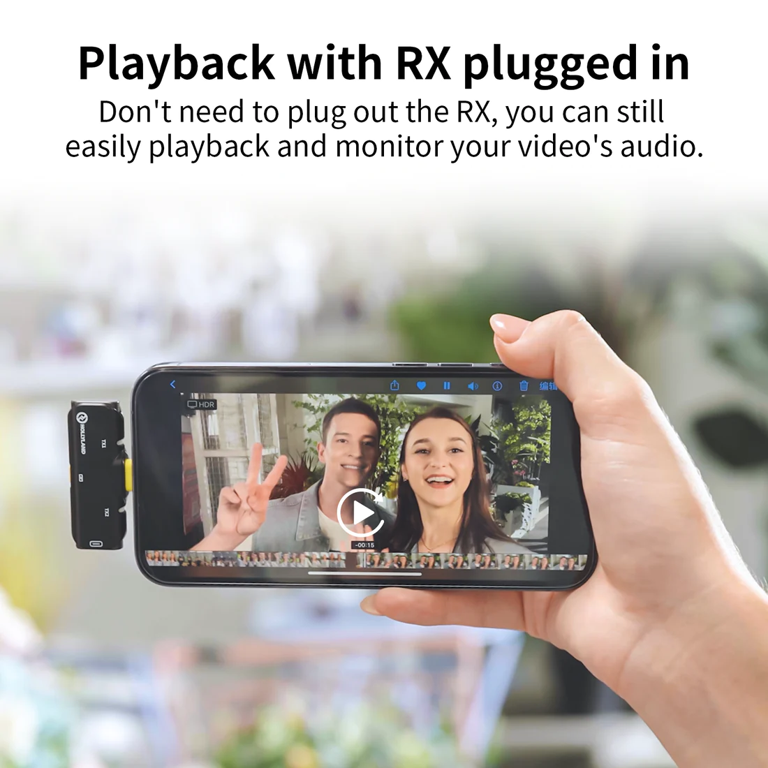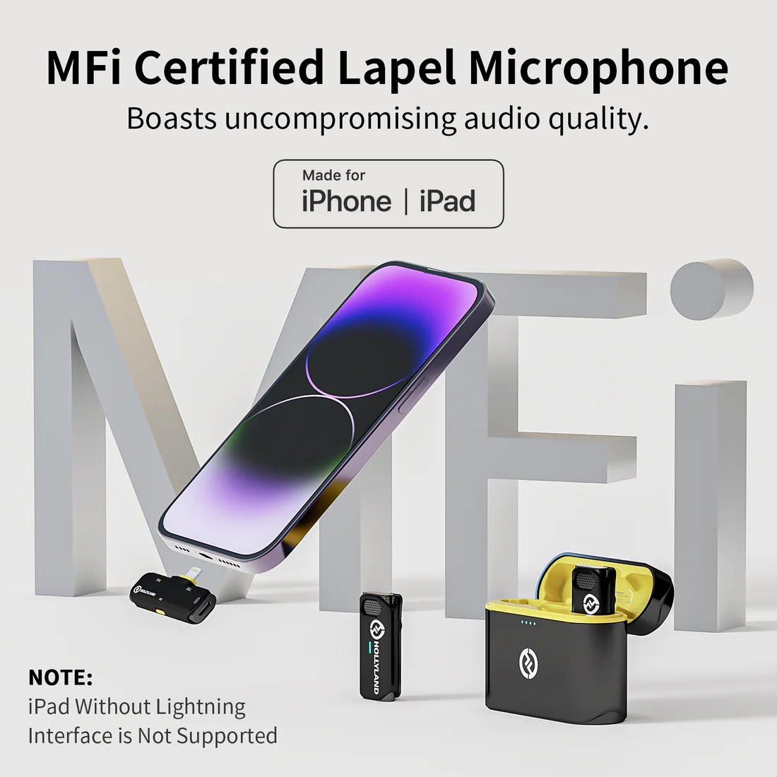 Record up to two people to your Lightning-equipped iOS device for mobile journalism or content creation, using the black LARK C1 DUO Wireless Microphone System from Hollyland. The system includes two transmitters with built-in, omnidirectional microphones and one dual-channel receiver—all with a compact form factor. Clips on the back of each transmitter allow you to attach them to the lapel of a shirt, while the plug-in receiver attaches directly to the Lightning port on your smartphone or tablet, which also supplies it with power.