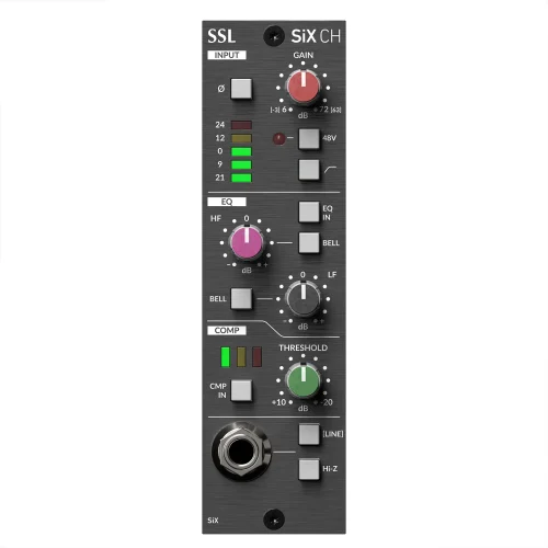 The Solid State Logic SiX CH is an elegant channel strip that packs the larger-than-life sound of SSL SuperAnalogue technology into a streamlined 500 series module. Equipped with channel processing features found on the universally renowned SSL SiX Console, the SSL SiX Channel offers a stunning preamp, classic SSL-style broad-stroke high and low shelving filters, and a 1-knob channel compressor that is surprisingly versatile. On top of that, the SiX Channel contains all the functionality you would expect from a workhorse channel strip, including 48V phantom power, a fixed highpass filter at 75Hz for eliminating unwanted low-frequency noise, a polarity switch, a front-panel line/instrument input, and a colorful 5-segment LED output signal meter. Upgrade your front end with this powerful, value-packed 500-series channel strip from Solid State Logic.